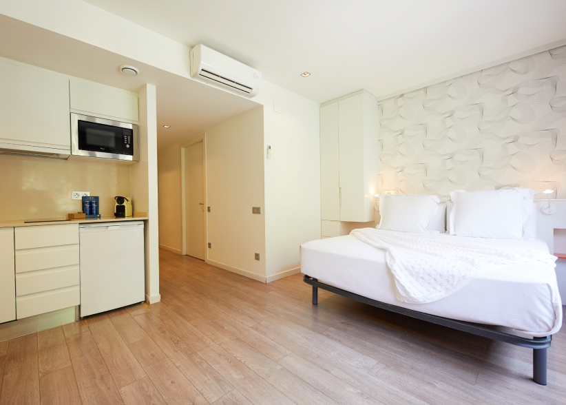 Apartamento de 33 m2 con un solo ambiente, con capacidad máxima de 2 personas. Cuenta con cocina equipada, baño privado y dormitorio con cama doble. Todos ellos son exteriores, con vistas a la calle o a un tranquilo patio interior (sujeto a disponibilidad). Se encuentra a 150 metros de la Sagrada Familia.
