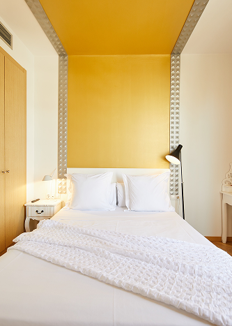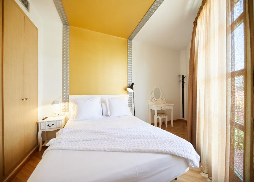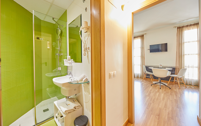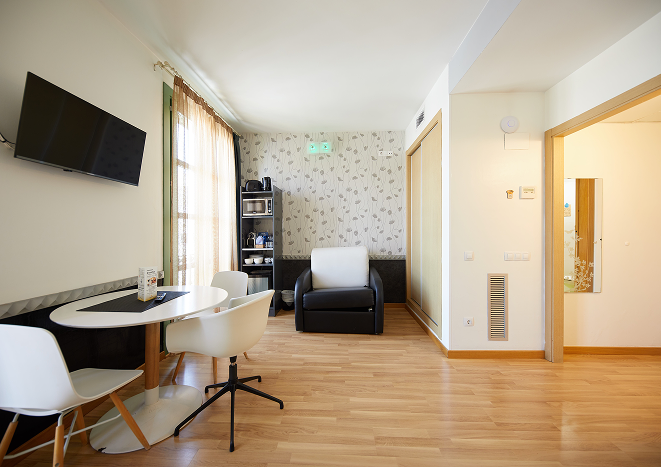 The Junior Suite, located on an upper floor of the building, has a surface area of 40 m² and a maximum capacity of 3 people. It features a private bathroom and a balcony with privileged views of the Sagrada Familia. The bedroom includes a double bed, separate from the living area, which is equipped with a sofa bed. Its elegant and romantic design makes it the perfect choice for a special stay in Barcelona. Although it does not include a full kitchen, the living area is equipped with a kettle, toaster, coffee maker, refrigerator, and microwave for your convenience.