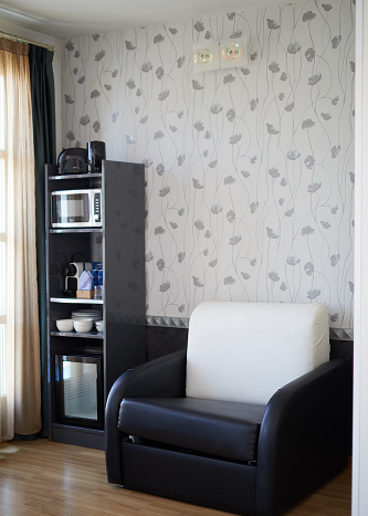 City views · Balcony · Heating · Soundproofing · Wooden/parquet floor · TV · Telephone · Dining table · Sofa bed · Refrigerator · Microwave · Electric kettle · Coffee maker · Towels · Bed linen · Iron · Hotel slippers · Free toiletries · Lift