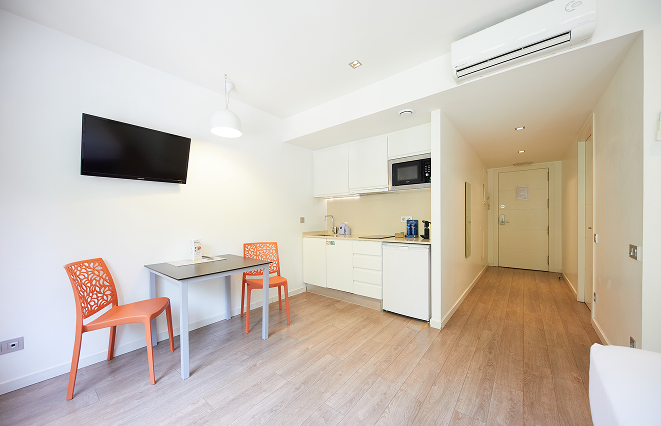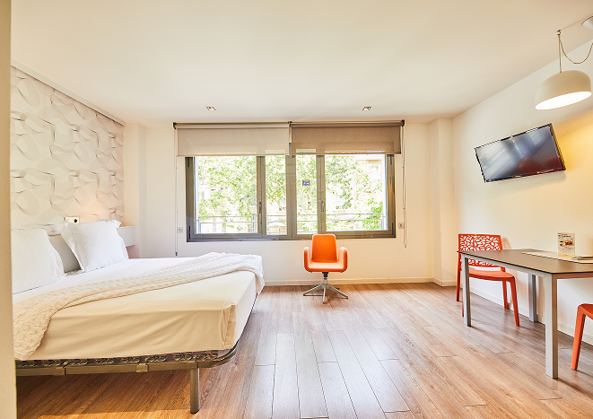 33 m² apartment with an open-plan layout and a maximum capacity of 2 people. It features a fully equipped kitchen, a private bathroom, and a bedroom with a double bed. All units are exterior, offering street views or overlooking a quiet inner courtyard (subject to availability). Located just 150 meters from the Sagrada Familia.