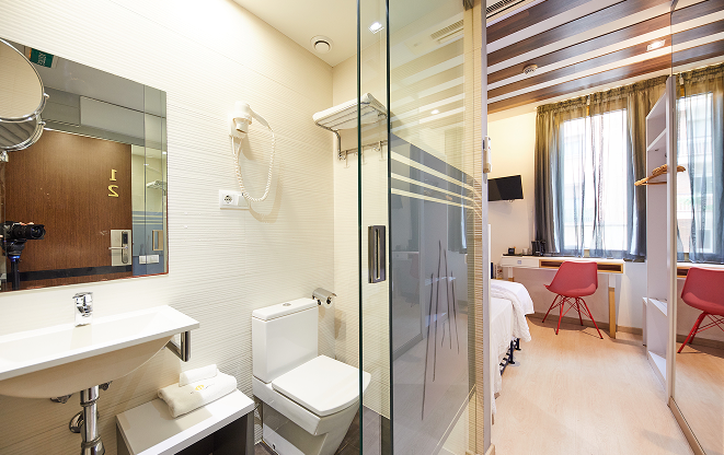 It overlooks the street. It has a private bathroom and a single bed (90 cm), air conditioning and heating, T.V. and desk.