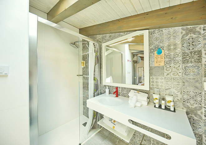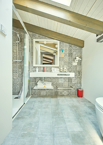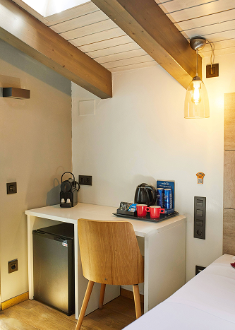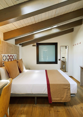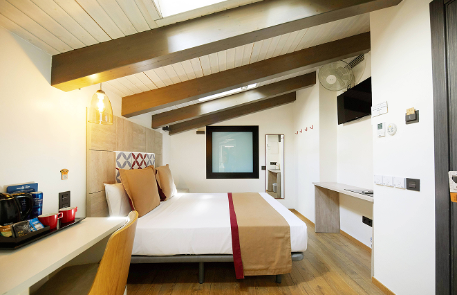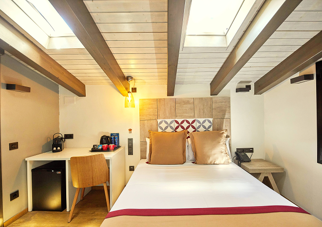 A 19 m² room located in the attic, featuring wooden ceilings. It offers one double bed or two single beds (upon request and subject to availability). It includes a full bathroom with shower, hot/cold air conditioning and TV. Maximum capacity for two people. It also includes free toiletries, as well as complimentary coffee and bottled water.