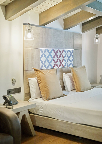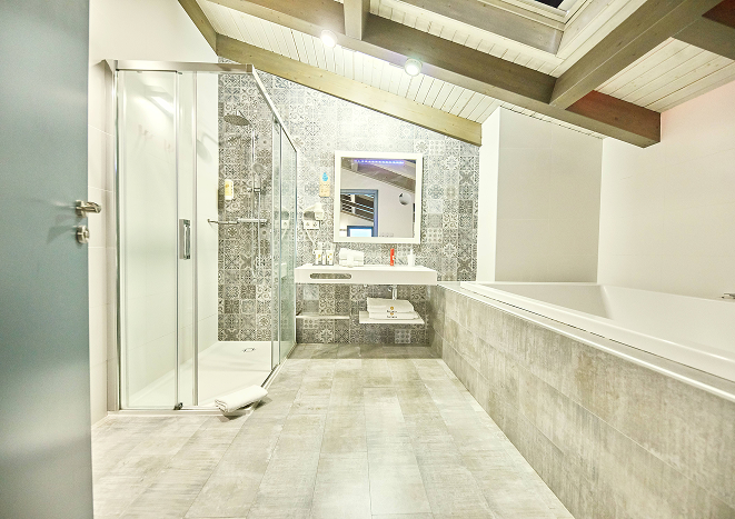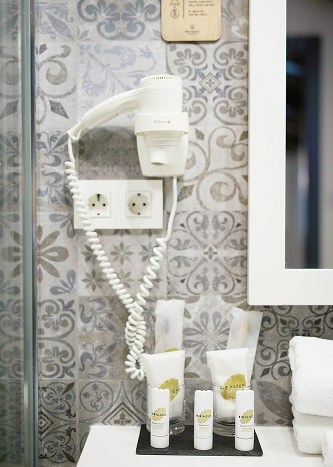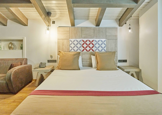 A 23 m² room located in the attic. It offers one double bed or two single beds (upon request and subject to availability). It includes a full bathroom with hydromassage bathtub and shower, hot/cold air conditioning, and a TV. Maximum capacity for two people. It also includes free toiletries, as well as complimentary coffee and bottled water.