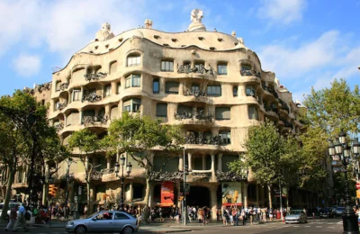 Casa Milà (also known as “La Pedrera”): This is the second most important house designed by Gaudí. The Milà family, advised by the Batlló family (who were delighted with the architect’s work), commissioned the brilliant architect to construct their house. This time Gaudí was inspired by the shape of a quarry (or “pedrera” in Catalan, hence its nickname) shaped by the waves of the sea. Built between 1906 and 1912, the spectacular building is one of the most visited places in Barcelona, declared a UNESCO World Heritage Site in 1984. Despite its size (it occupies a whole chamfered block), its sinuous shapes and the play of light give the sensation of being in motion. As is usual, he was inspired by the forms of nature, a hallmark of Gaudí’s works. The architect often used materials from Catalonia and in this house used limestone for the façade, except in the upper part, which is covered with white tiles, simulating a snow-capped mountain.