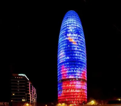 Torre Glòries (formerly Agbar): One of Barcelona’s most famous skyscrapers, being the third tallest building in Barcelona after the Hotel Arts and the Torre Mapfre. It is located next to Plaça de les Glòries and the renewed Encants market, and is one of the symbols of Barcelona’s skyline. The most characteristic feature of this 34-storey, 145-metre tower is its lighting. It has more than 4,500 LED lights that project different shapes and drawings while changing colour. Due to its characteristics, it is easy to see it from several points of Barcelona and it has become one of its tourist icons. Without doubt, the best moment to visit it is at nightfall, when its facade fills with colour. The tower, since 2017 owned by Merlin Properties, belonged to Aguas de Barcelona (Agbar, hence its name), and was designed by the architect Jean Nouvel, who was inspired by the rounded shape of Montserrat mountains and the bell tower of the Sagrada Familia by Antoni Gaudí.